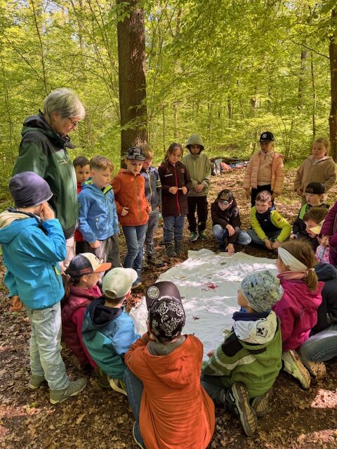 Zunächst ging es zum ausgewählten Platz im Wald. Am Rastplatz, dem sogenannten Waldsofa, wurde eine kurze Vesperpause eingelegt. Anschließend startete das Programm mit dem Kennenlernen einheimischer Vögel, ihrer Gesänge und Lebensgewohnheiten. Immer zwei Kinder bildeten ein Vogelpaar und mussten mithilfe ihres jeweiligen Vogelgesangs zueinander finden. So hörte man beispielsweise die Kohlmeise mit ihrem „zizidäh“, die Amsel mit ihrem „tü rü lü“ oder den Buchfink mit seinem „dumdi dah“.